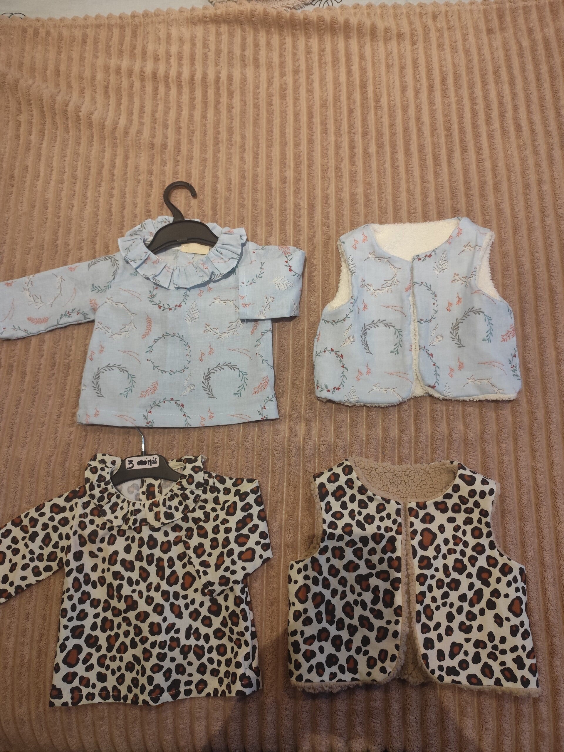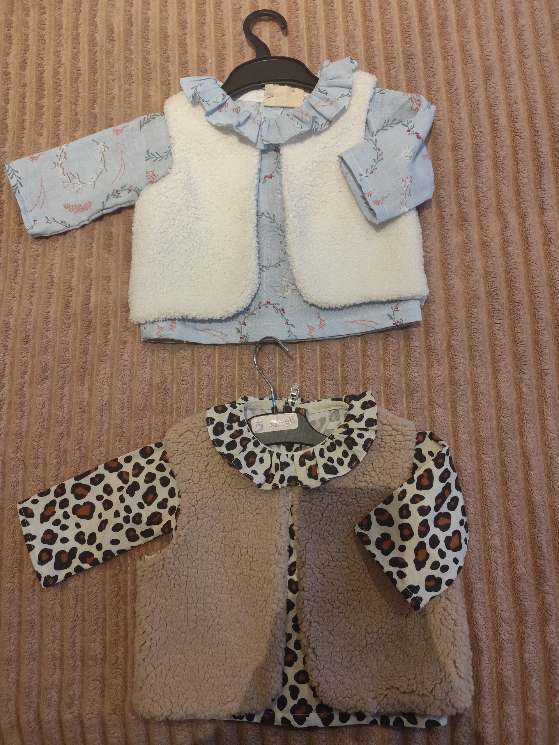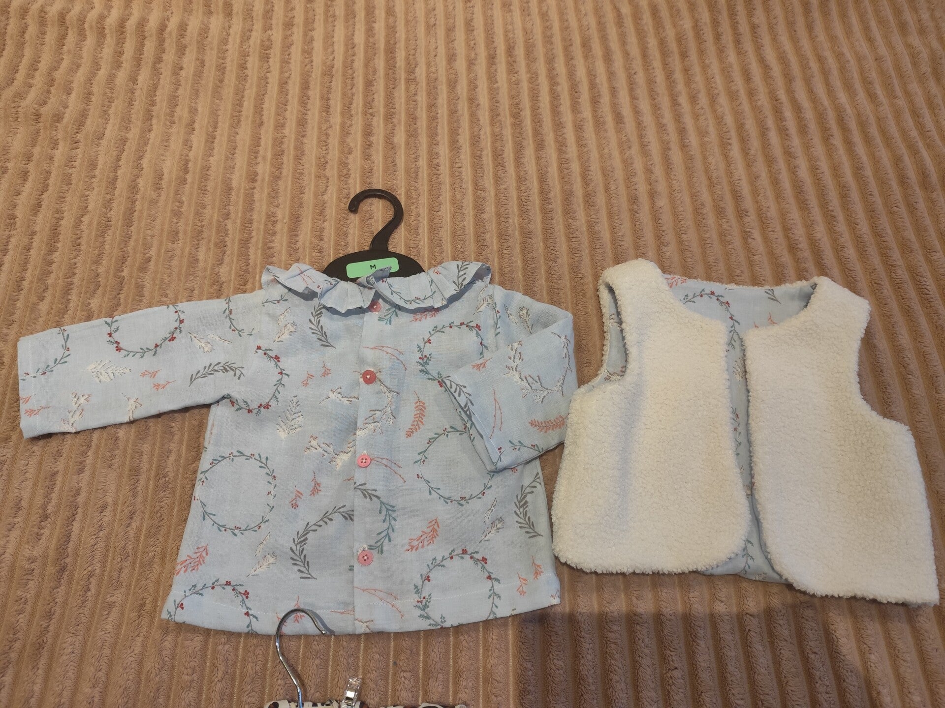 Chemise en coton bleu clair avec couronnes fleurs et son gilet coton puis sherpa écru. Taille 3 mois